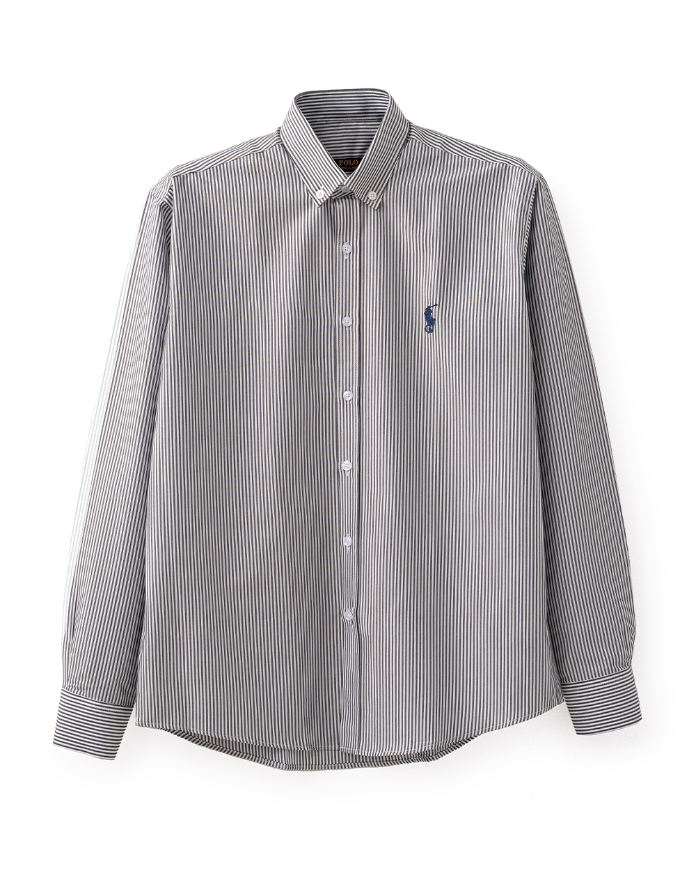 قميص رجالي بأكمام طويلة مخطط باللون الأسود على الأبيض، مزود بياقة بأزرار وشعار مطرز، تصميم كلاسيكي مناسب للعمل والإطلالات الرسمية أو الكاجوال اليومية